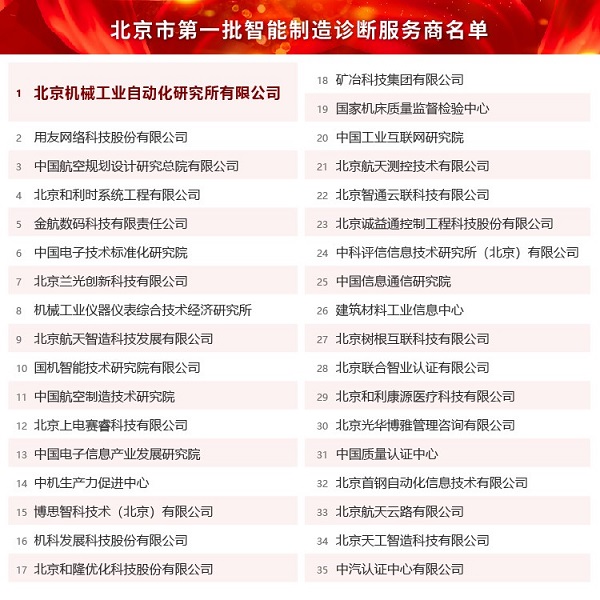 2021年12月22日,北京市經(jīng)濟和信息化局公布了“北京市第一批智能制造診斷服務(wù)商”名單,北京機械工業(yè)自動化研究所有限公司(以下簡稱“北自所”)成功入選。