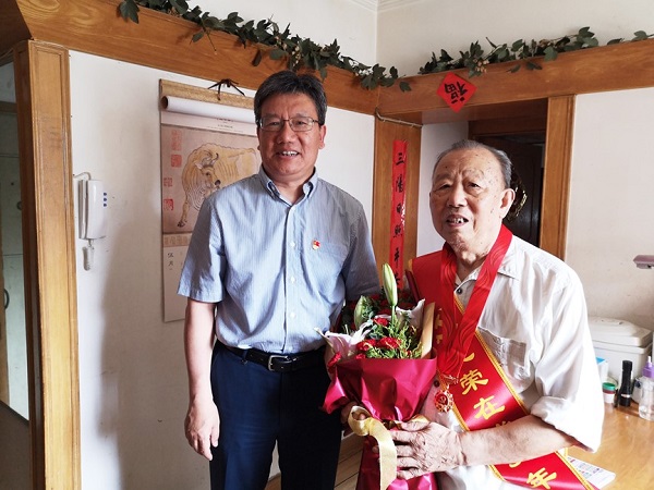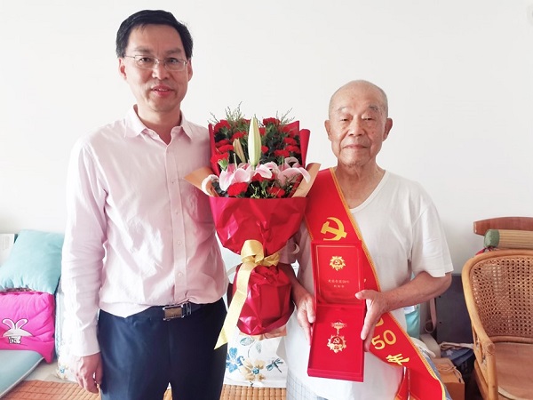 6月28日,北自所黨委書記、董事長王振林,黨委副書記、總經理李金村,黨委副書記、紀委書記、工會主席岳秀江,代表公司黨委班子,來到離退休老黨員家中走訪,為黨齡50年的老黨員頒發“光榮在黨50年”紀念章。