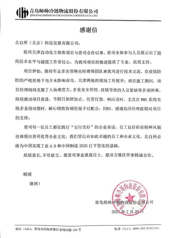 項目執行過程中,正值新冠疫情在我國冷鏈行業肆虐之時,北自科技團隊展示了良好的精神風貌和職業素養,克服了重重困難,以認真的態度、專業的管理和過硬的技術感動了客戶,客戶特地發來感謝信,以表彰北自科技團隊在項目中的突出表現。