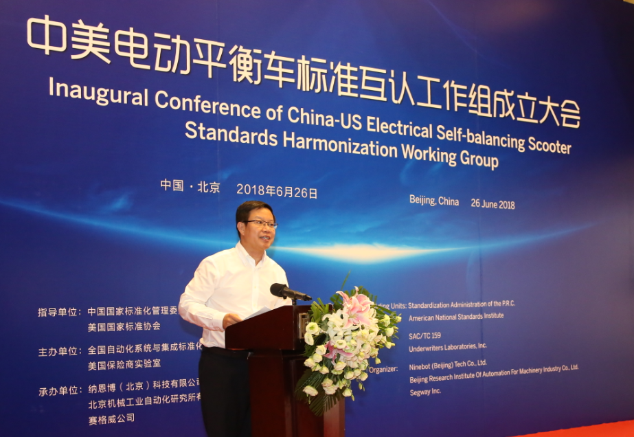 6月26日,中美電動平衡車標準互認工作組成立大會在北京唯實大廈成功舉行。全國自動化系統與集成標準化技術委員會主任委員、機械總院集團董事長王德成與美國保險商實驗室全球副總裁 Philip M.Piqueira分別代表中美雙方簽署電動平衡車標準互認合作協議。中國國家標準化管理委員會副主任殷明漢、IEC美國國家委員會副主席Sonya Bird、美國大使館參贊Cynthia Griffin、北京航空航天大學教授王田苗、全國自動化系統與集成標準化技術委員會秘書長黎曉東、Segway-Ninebot公司總裁王野等領導及電動平衡車國家標準起草組專家出席會議,共同見證了中美兩國標準化合作的歷史時刻。